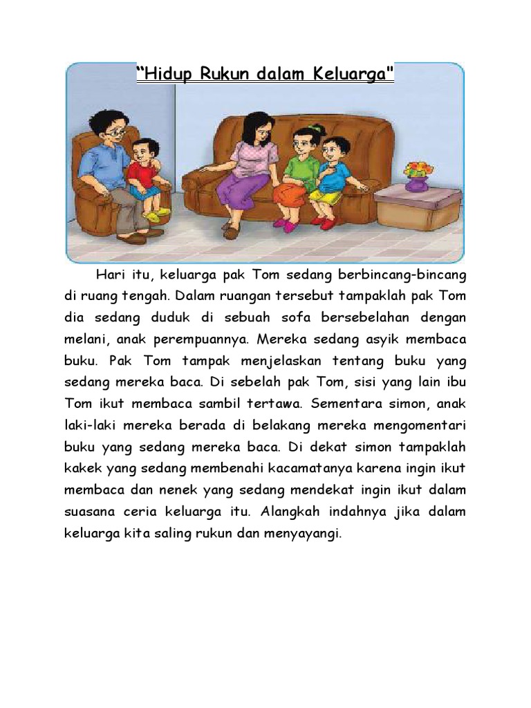 Hidup rukun kerukunan perlu dijaga dalam kehidupan kita. Cerita Seorang Anak Di dalam keluarga kami mempunyai kebiasan yang berbeda tetapi kami saling menghormati. Hormat pada ayah dan ibu sudah termasuk ke dalam bentuk hidup rukun di rumah dan keluarga.
